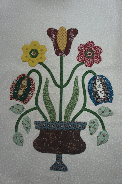 The quilt will consist of (61) 6" finished blocks: 9 blocks will be hexagon flowers appliqued onto a background square; 4 blocks will have different Rose of Sharon applique flowers and 48 blocks will be different machine pieced sampler blocks.