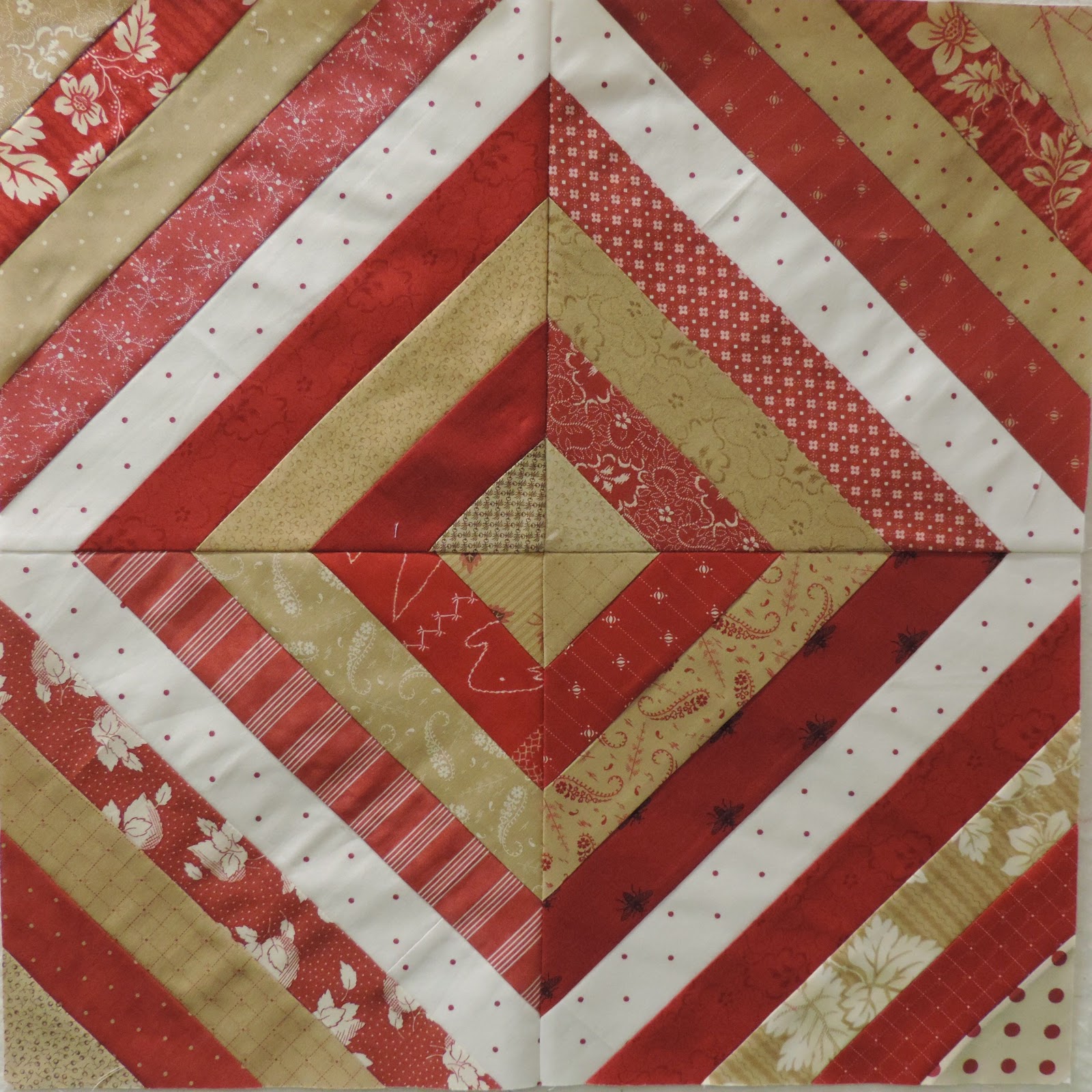More "Charlotte" babies were begun. This is the first block of four string pieced squares made by Jan in stunning reds and creams in a controlled random fashion! Lol.
